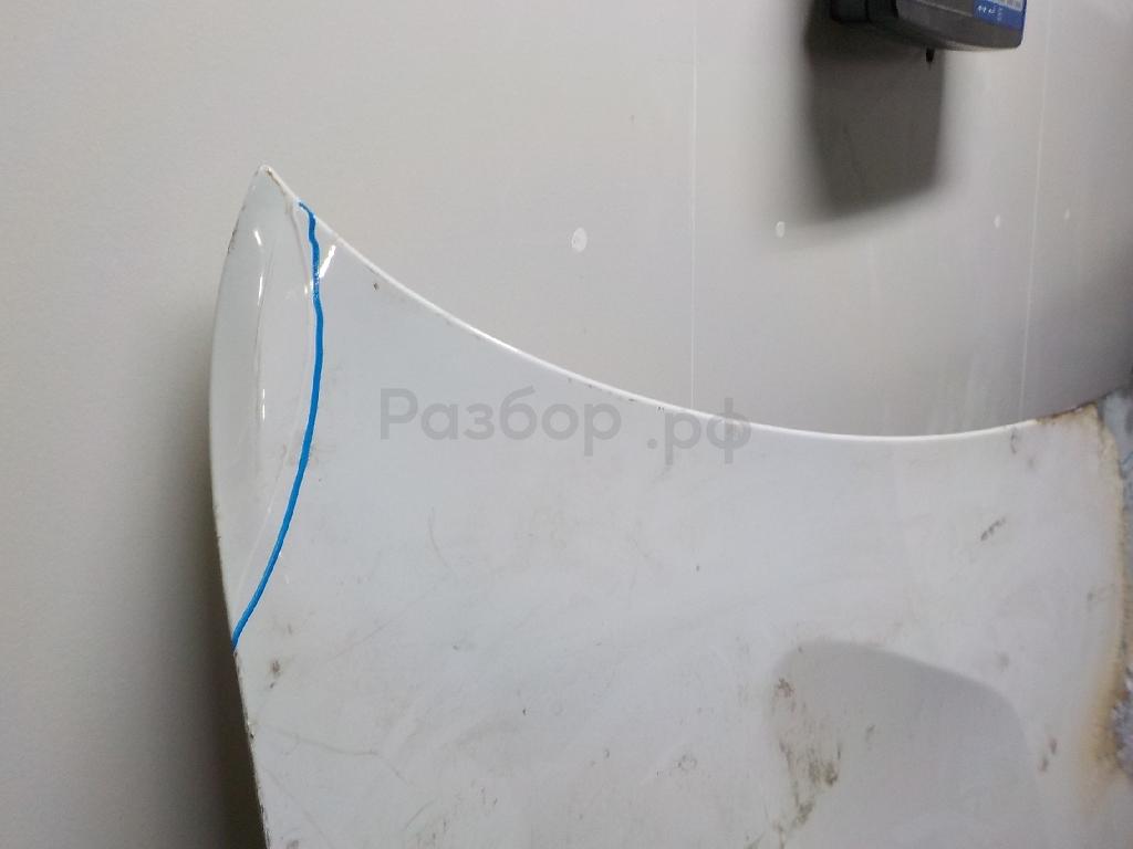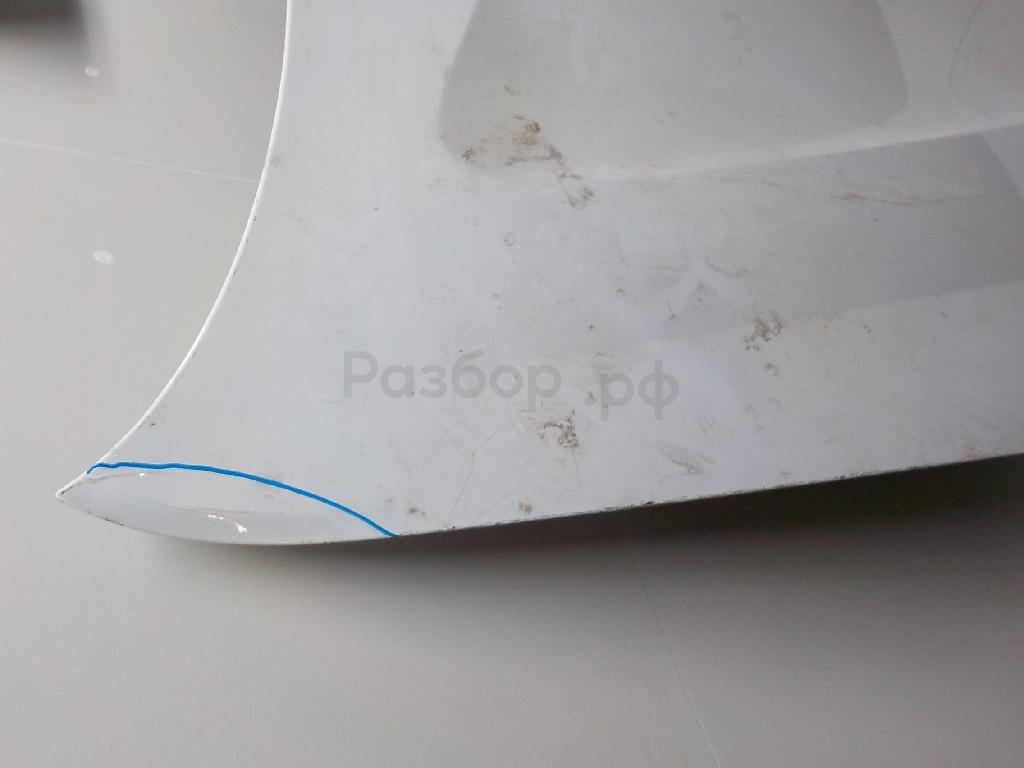 Состояние детали хорошее. Белого цвета, потертости. Небольшая вмятинка в месте примыкания к бамперу. Потребуется ремонт и покраска