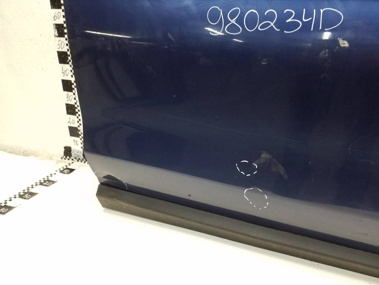 Состояние детали удовлетворительное. Синего цвета, потёртости, царапины. Царапины с вмятинами на плоскости и арке двери. Потребуется ремонт и покраска
