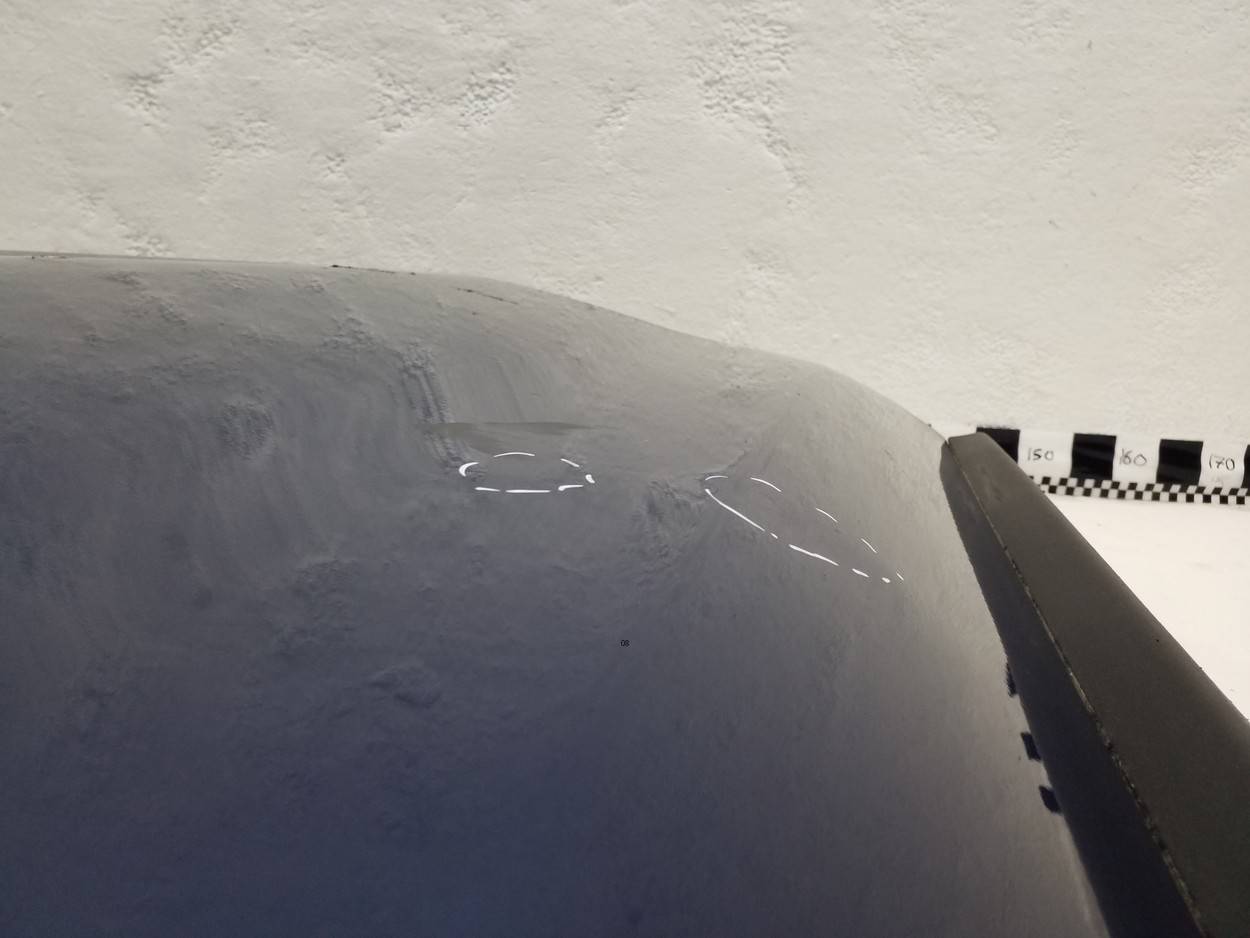 Состояние детали плохое. Синий цвет, потёртости. Вмятина и надрыв металла в передней верхней части, вмятина в нижней части. Ремонт вмятин и трещины