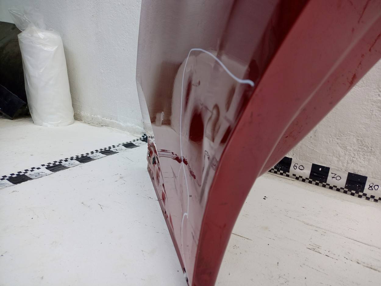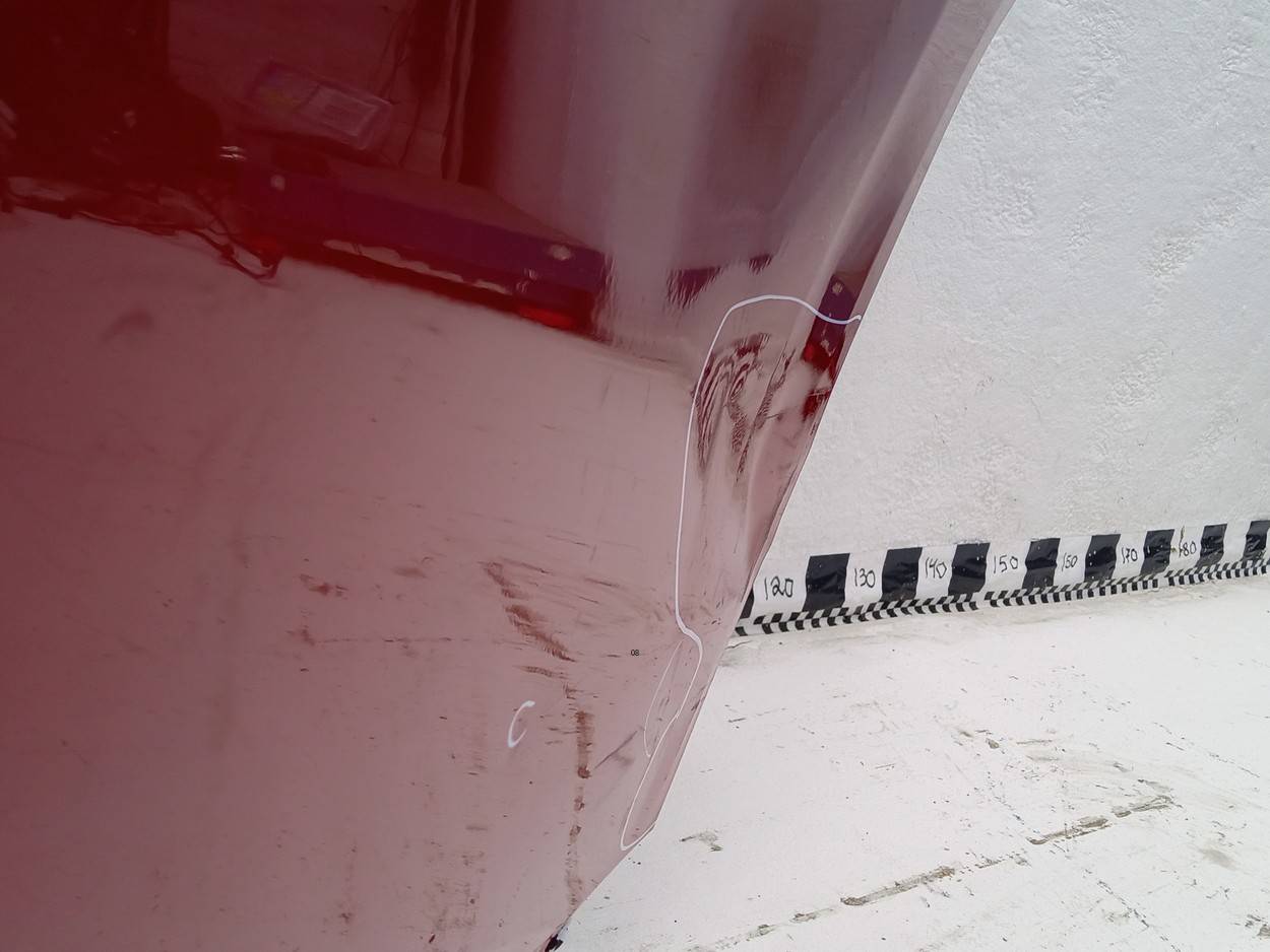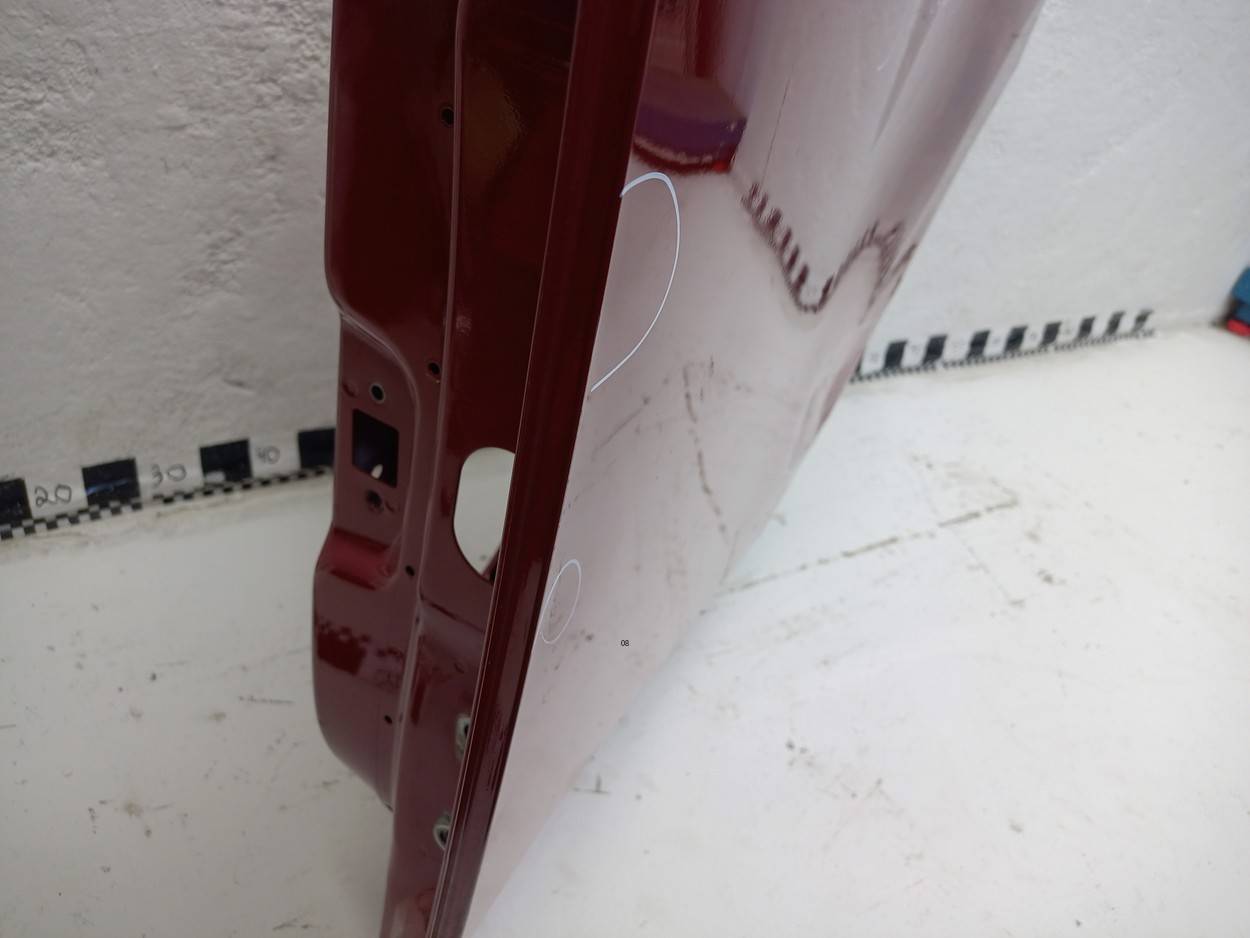 Состояние детали удовлетворительное. Красного цвета, потертости, царапины. Царапина с вмятиной на ребре, плоскости и кромке справа, слегка загнута кромка спереди. Потребуется ремонт и покраска