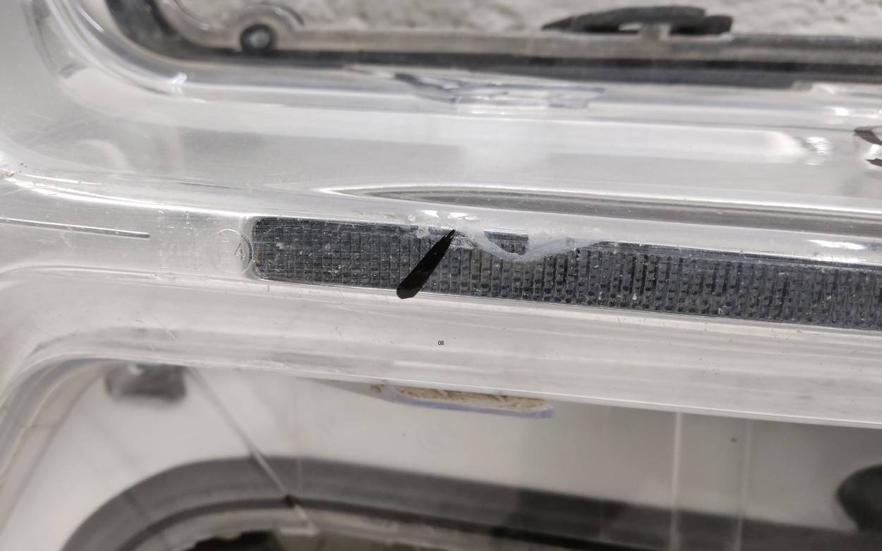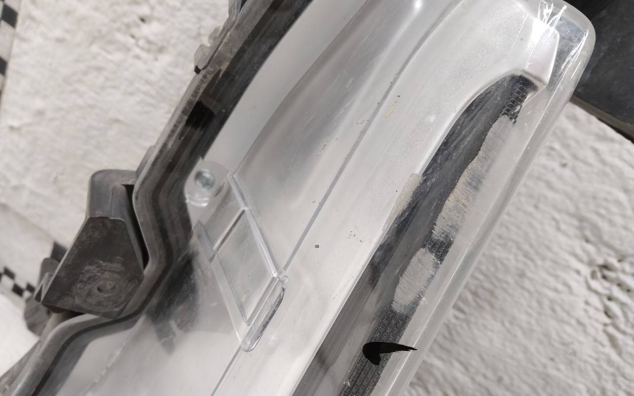 Состояние детали удовлетворительное. Следы эксплуатации, есть блок, корпус целый. Царапины и потёртости, дефект одного крепления, дыра в правый нижней части фары с лицевой стороны. Требуется ремонт