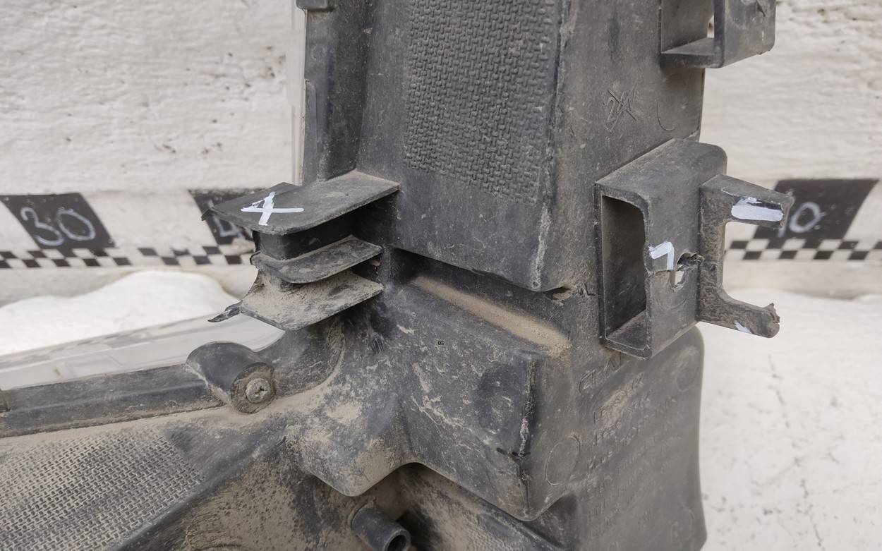 Состояние детали хорошее. Следы эксплуатации. Деформирован кронштейн. Замятие сот.. Деформированный верхний правый кронштейн. Незначительные замятия сот.. Потребуется ремонт
