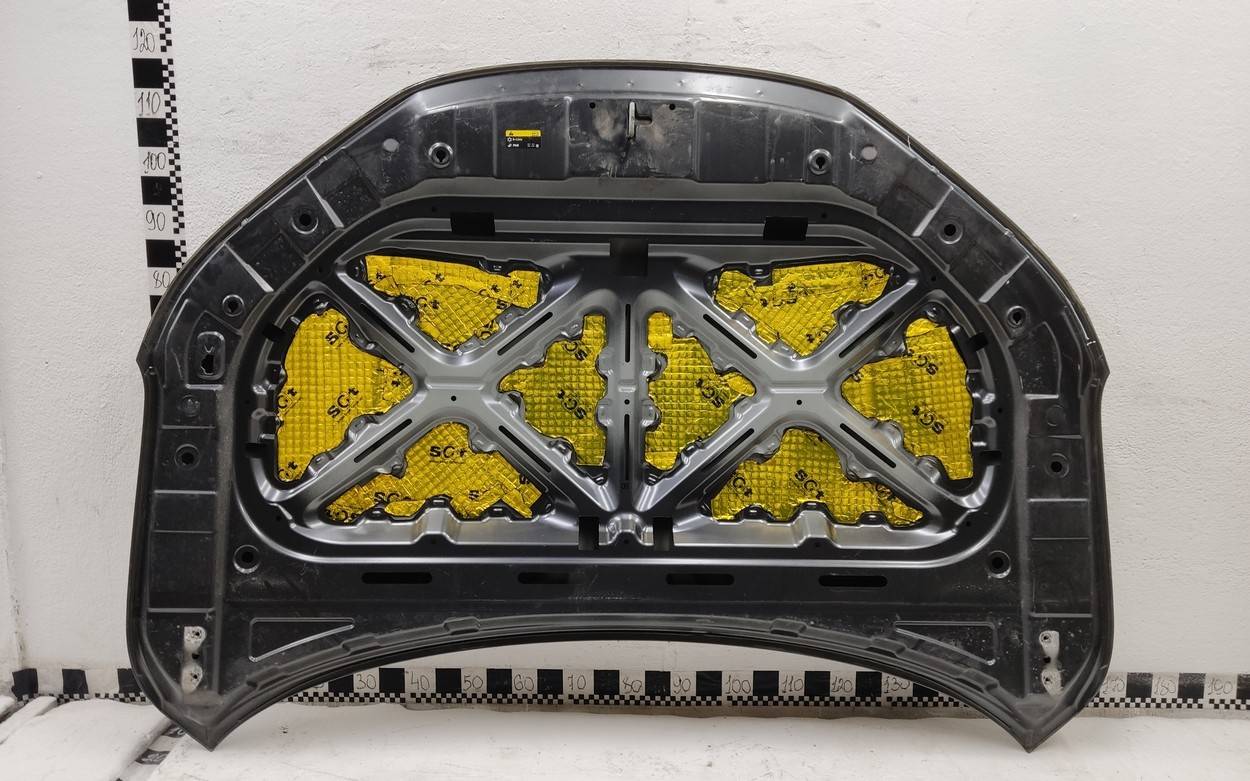 Состояние детали удовлетворительное. Капот серого цвета, следы эксплуатации. Повреждение внутреннего каркаса слева, замятие капота слева, тычки по центру капота, вмятина в передней части капота. Потребуется ремонт