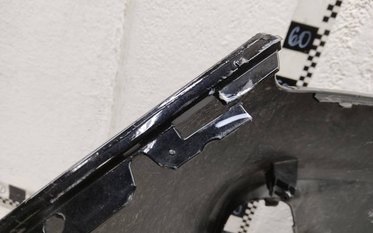 Состояние детали хорошее. Чёрного цвета царапинки. Небольшой дефект пластика по верхней кромке слева. Отсутствуют три крепления под верхнюю решетку и одно под накладку. Одно верхнее левое крепление лопнуло. Потребуется незначительный ремонт