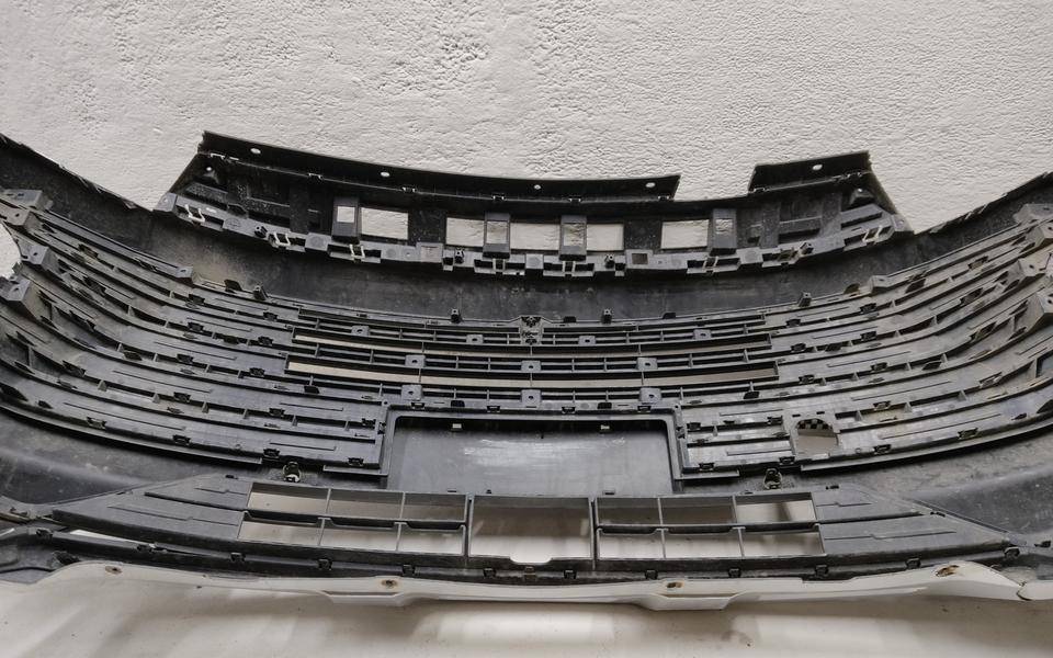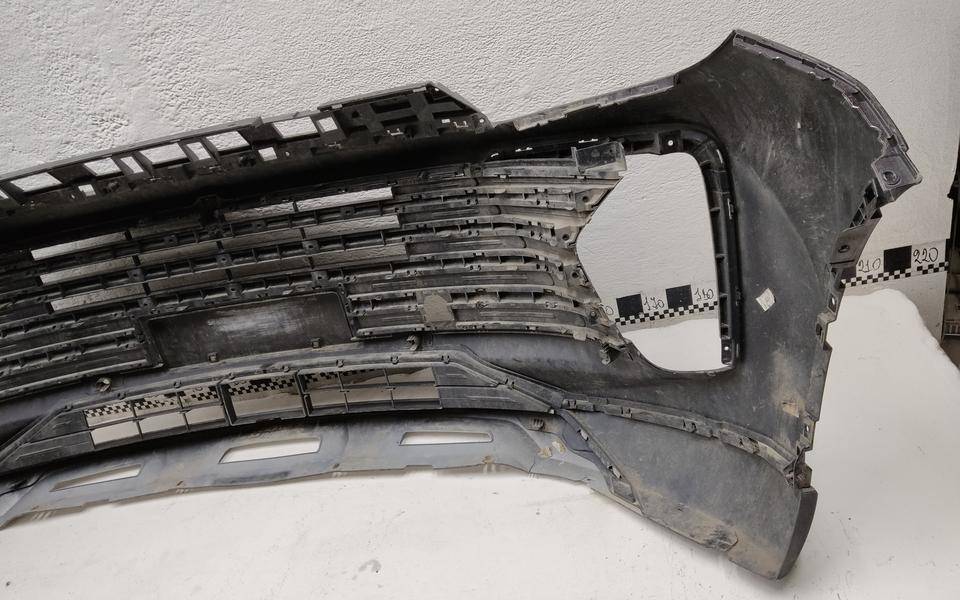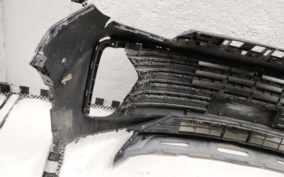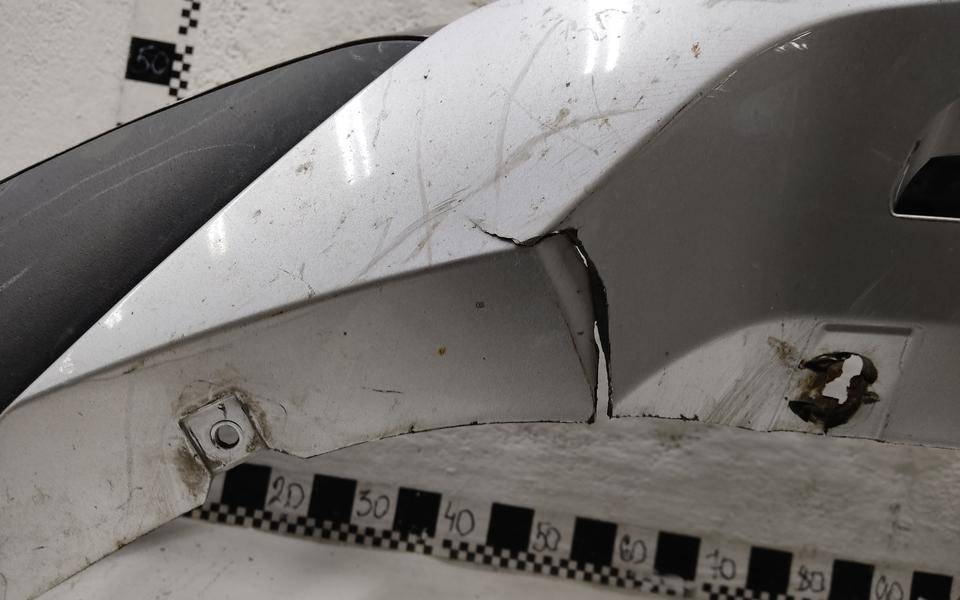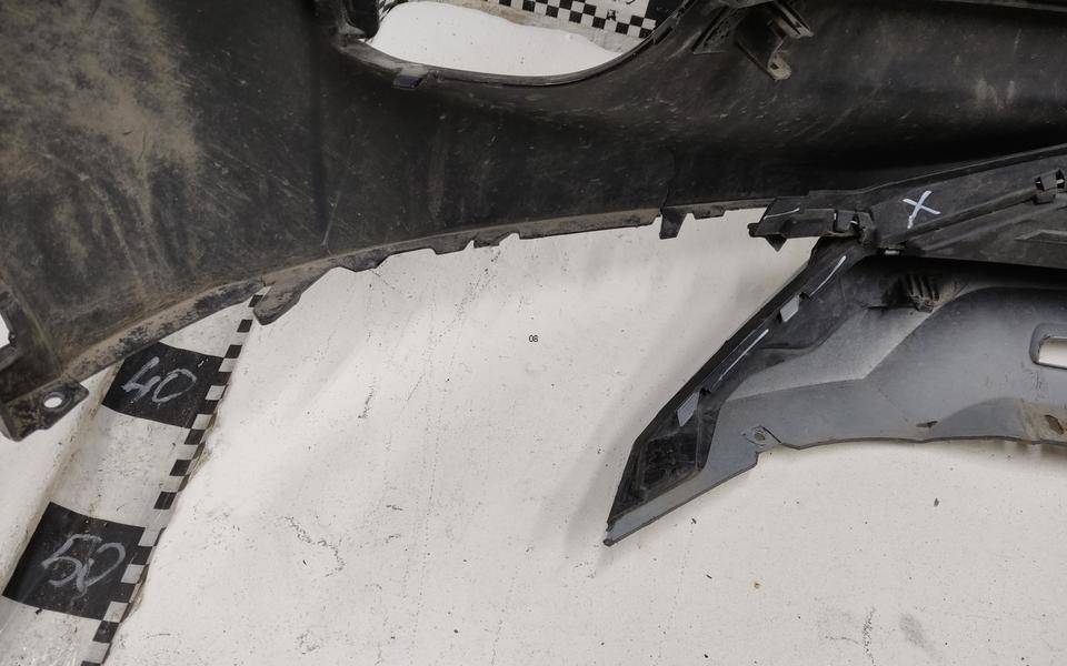 Состояние детали удовлетворительное. Серого цвета, потертости, царапинки. Деформация и трещина пластика у площадки под номер, сломано два крепления решетки слева и справа и одно юбки справа, основные крепления целые. Потребуется ремонт и покраска