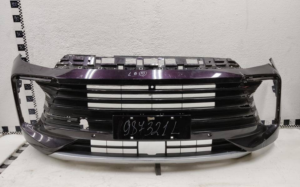 Состояние детали удовлетворительное. Фиолетового цвета под парктроники, трещины, дефект пластика (протёрто насквозь) бампера и центральной решетки. Отсутствует фрагмент юбки. Крепления бампера целые. Потребуется ремонт Бампер передний для Chery ExTXL19>