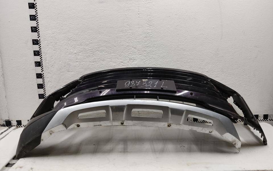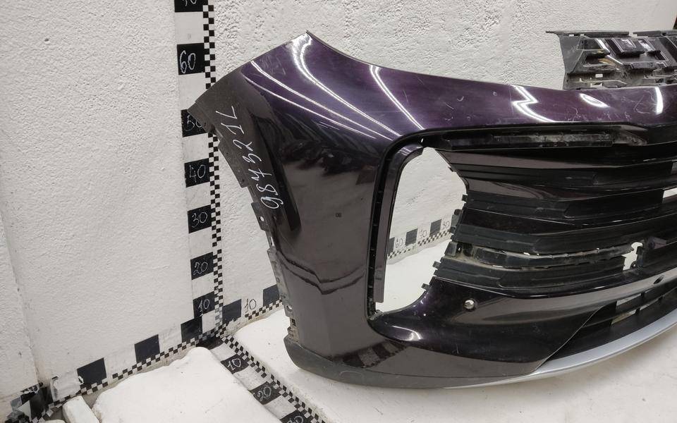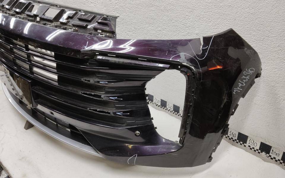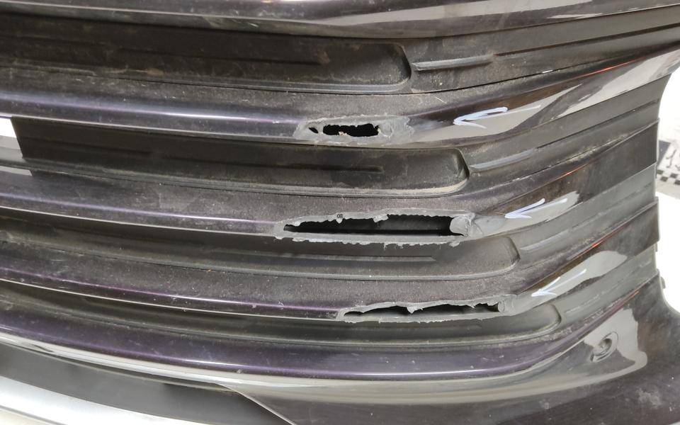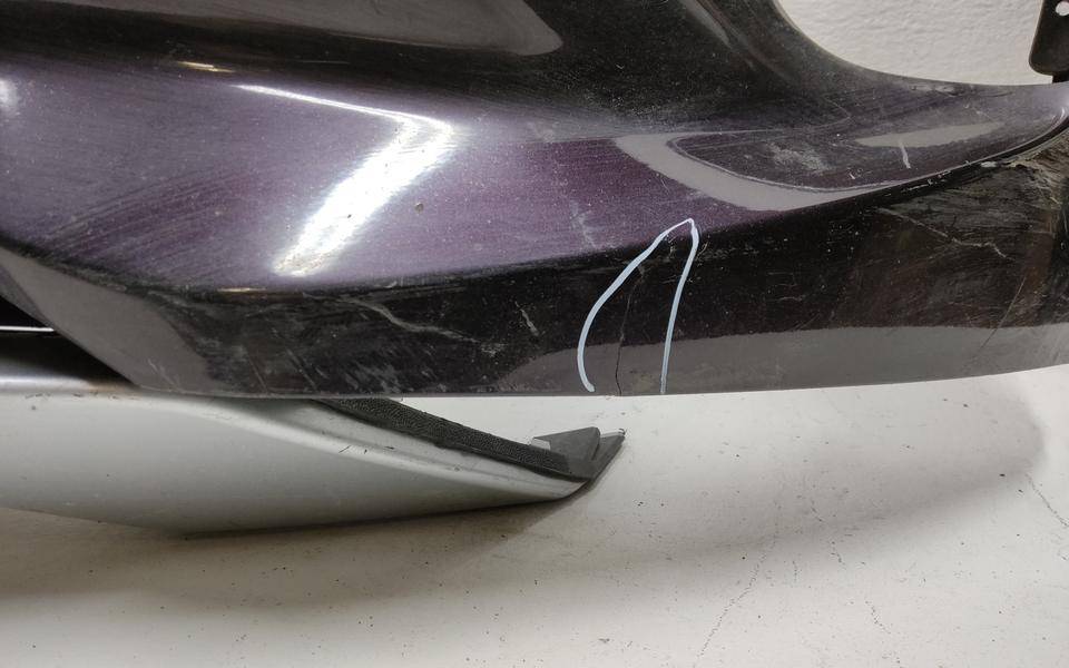 Состояние детали удовлетворительное. Фиолетового цвета под парктроники, трещины, дефект пластика (протёрто насквозь) бампера и центральной решетки. Отсутствует фрагмент юбки. Крепления бампера целые. Потребуется ремонт