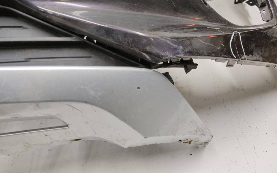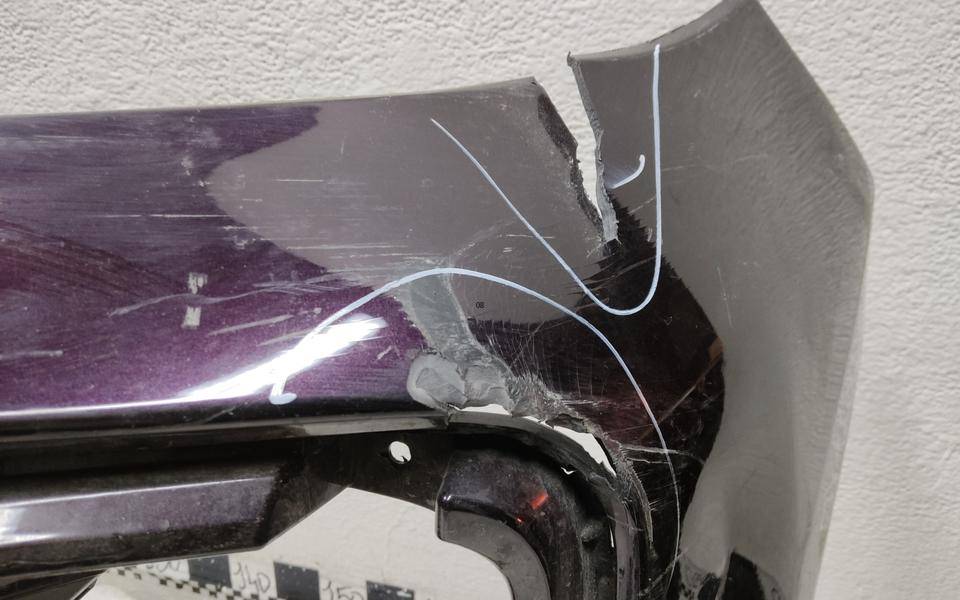 Состояние детали удовлетворительное. Фиолетового цвета, потёртости, царапинки. Трещина пластика бампера слева, крепления целые. Потребуется ремонт и покраска