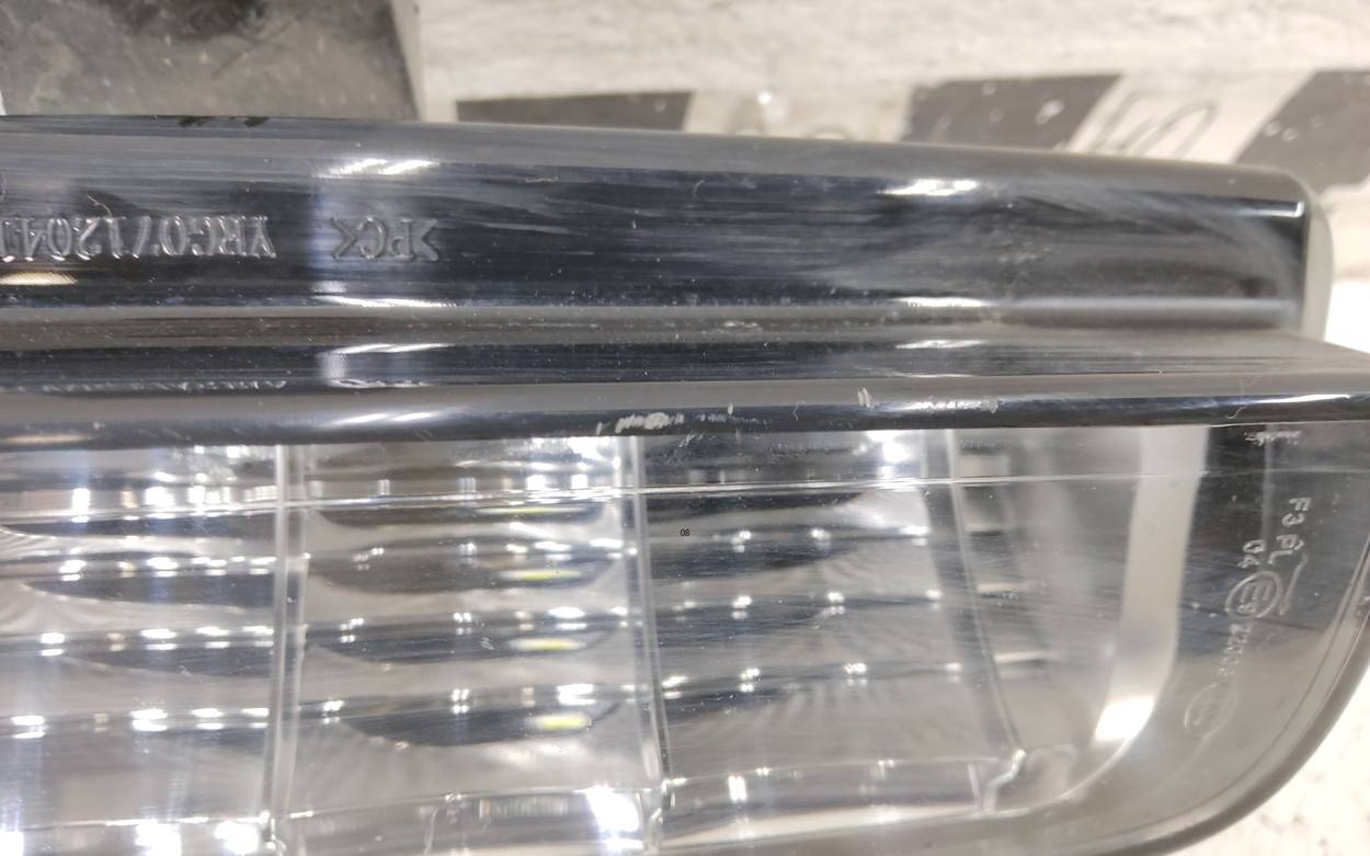 Состояние детали плохое. Следы эксплуатации, потёртости. Трещины, отсутствует небольшой фрагмент корпуса, в районе крепления номерного знака, крепления целые. Ремонт корпуса