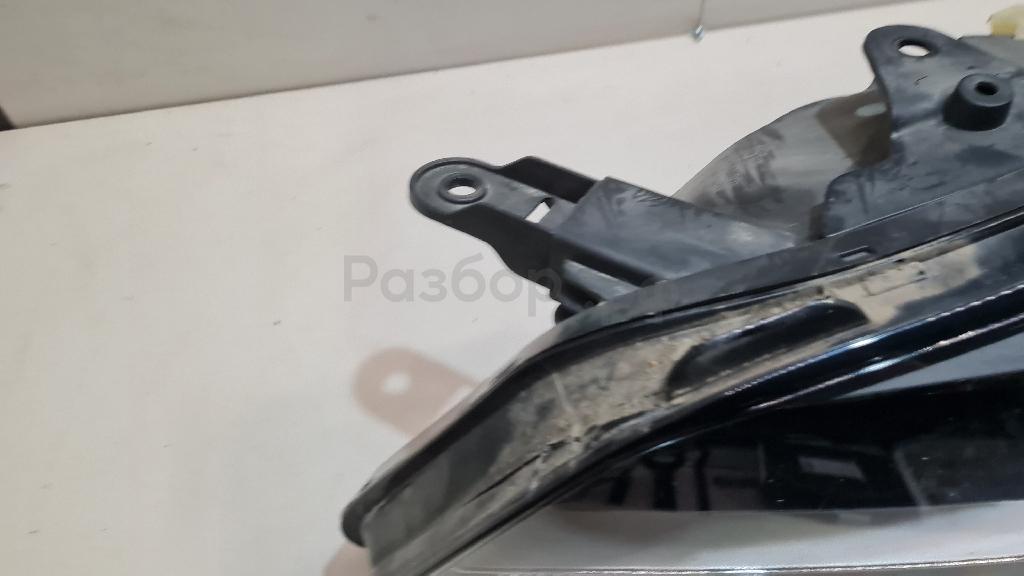 Состояние детали удовлетворительное. Потёртости на стекле, трещины и отсутствуют фрагменты пластика стекла со стороны решётки радиатора. Сломано одно крепление, дефект корпуса в этом месте. Потребуется ремонт