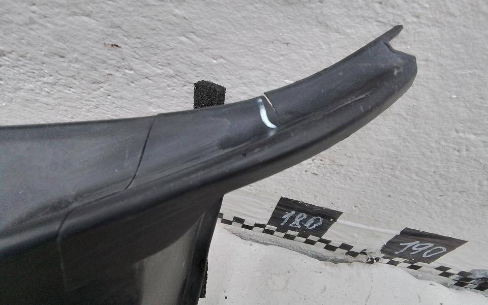 Состояние детали плохое. Серый цвет, потёртости, после частичного ремонта, в сборе с юбкой. Дефект боковых креплений бамперы и юбки с левой стороны, дефект крепления левой ПТФ, трещина с левой стороны в районе крепления решётки, запаяны трещины в средней части и с левой стороны. Ремонт трещины и креплений