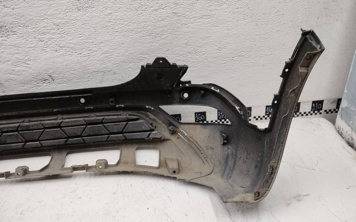 Состояние детали плохое. Серый цвет, потёртости, после частичного ремонта, в сборе с юбкой. Дефект боковых креплений бамперы и юбки с левой стороны, дефект крепления левой ПТФ, трещина с левой стороны в районе крепления решётки, запаяны трещины в средней части и с левой стороны. Ремонт трещины и креплений