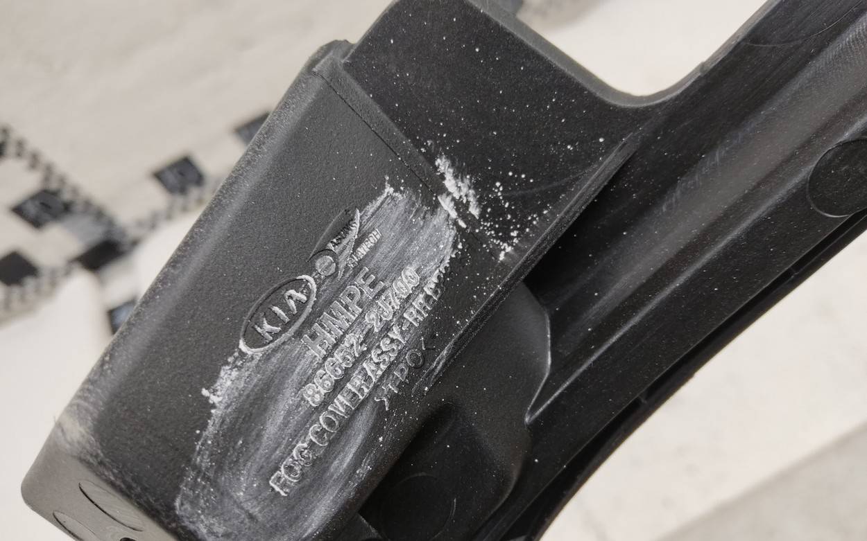 Состояние детали хорошее. Под парктроники, трещинка в месте крепления накладки, царапины. Отсутствуют два крепления под левую ПТФ, дефект одного на фото. Потребуется ремонт