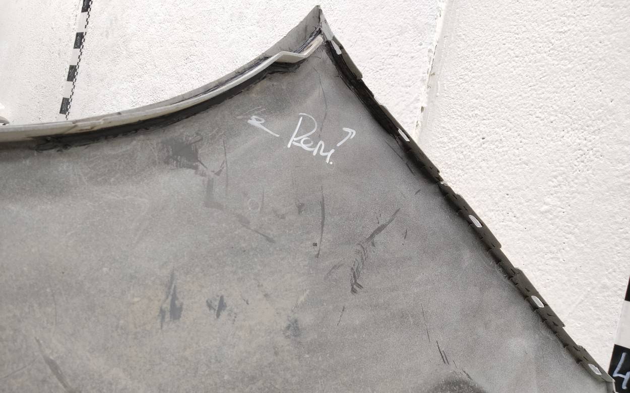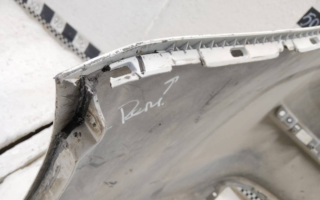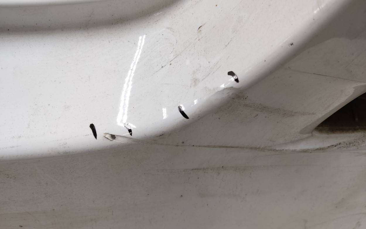 Состояние детали удовлетворительное. Белого цвета, после небольшого ремонта. Вмятина, царапины. Отсутствуют три крепления. Потребуется дополнительный ремонт