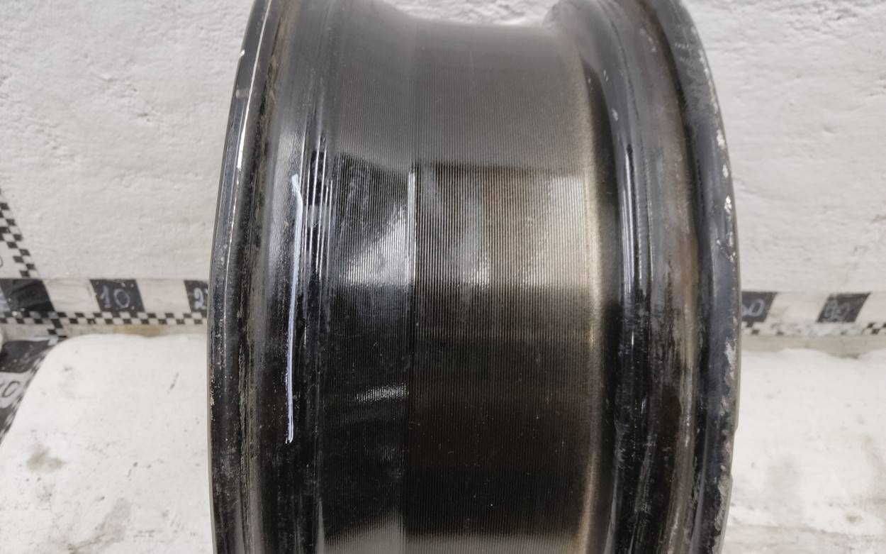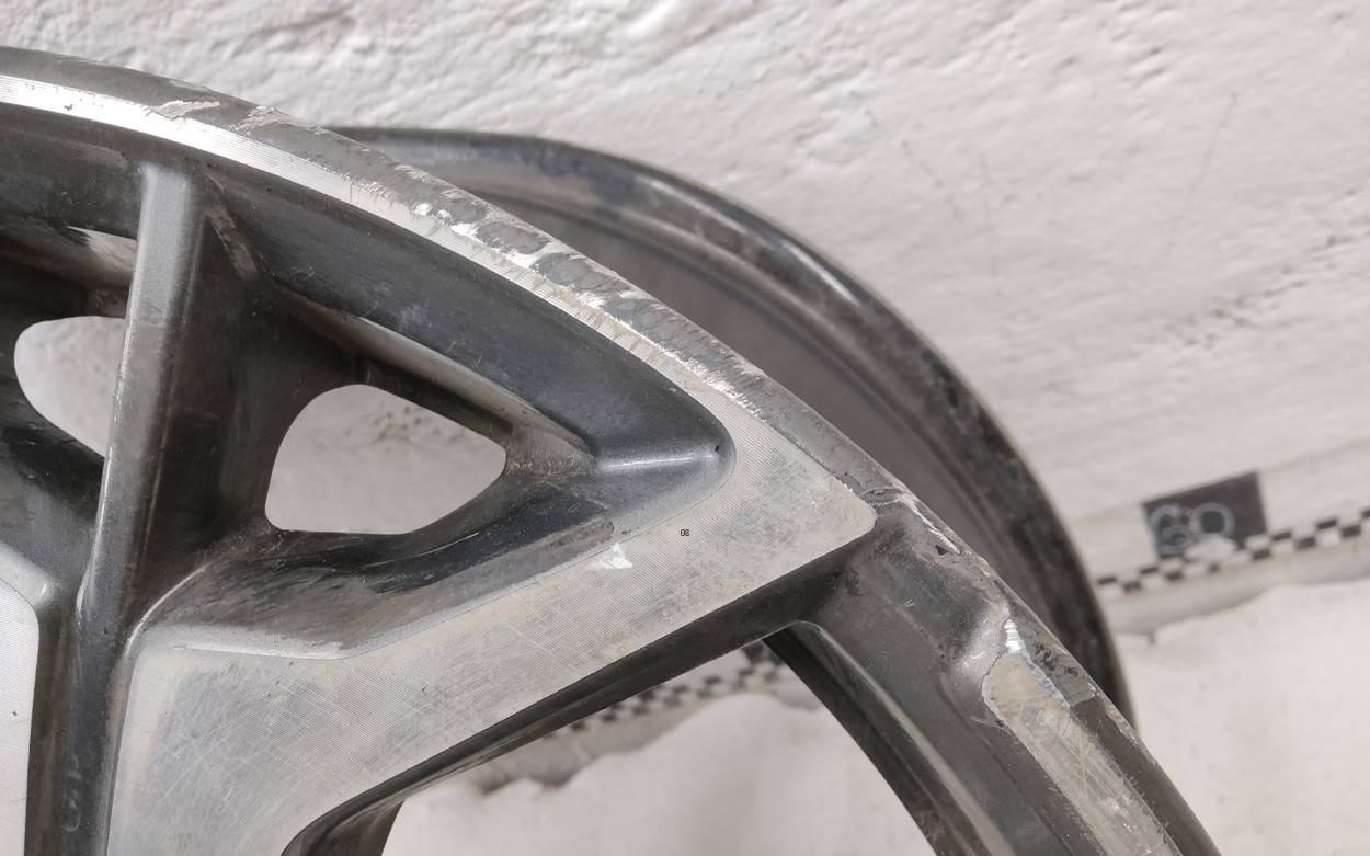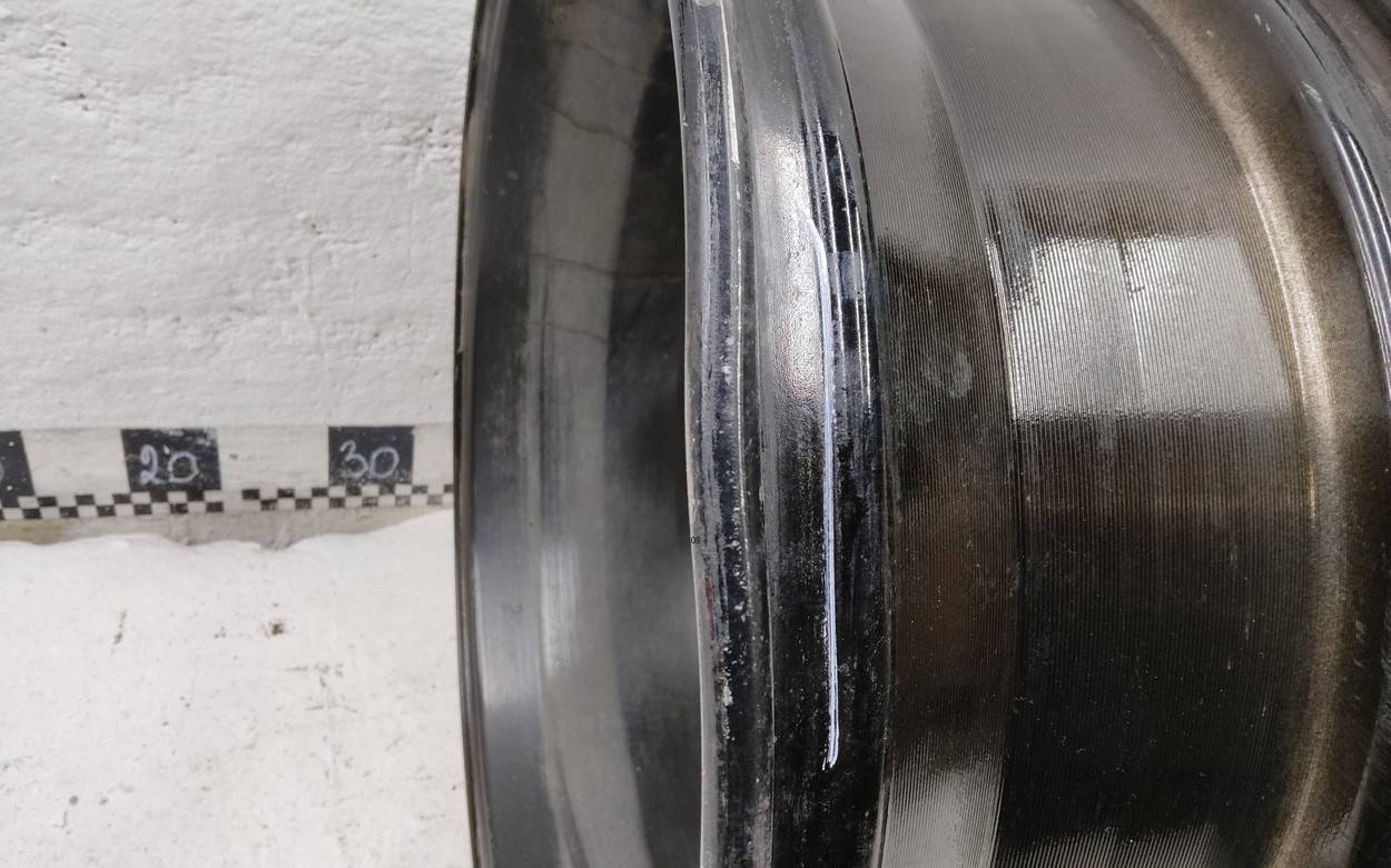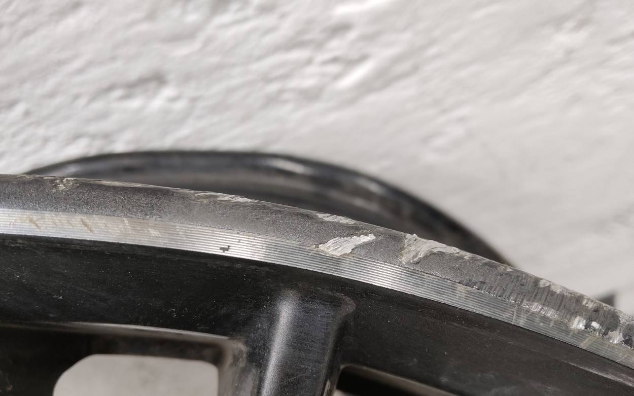 Состояние детали удовлетворительное. Тёмно-серого цвета, царапинки по внешнему ободу. Вмятина на внутреннем ободе. Потребуется ремонт