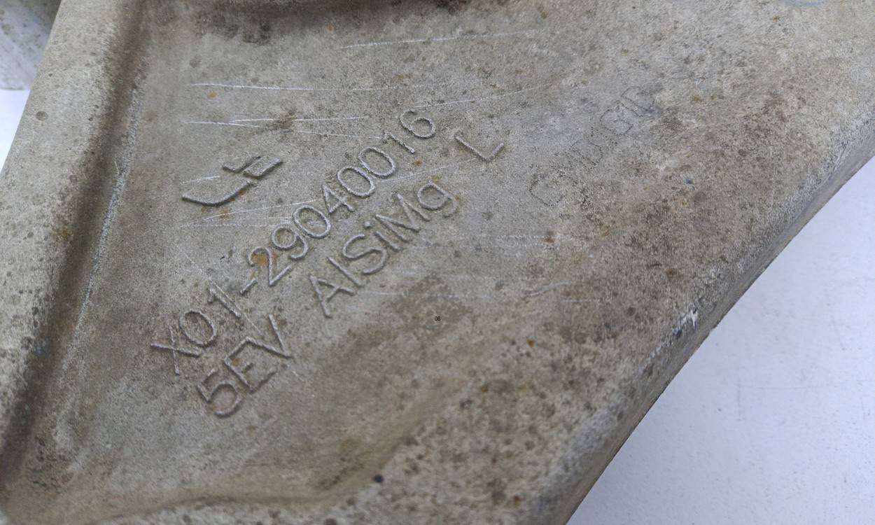 Состояние детали удовлетворительное. Черного цвета в пленке. Надломано ухо крепления слева, справа такое же ухо сломано, трещина снизу справа. Потребуется ремонт