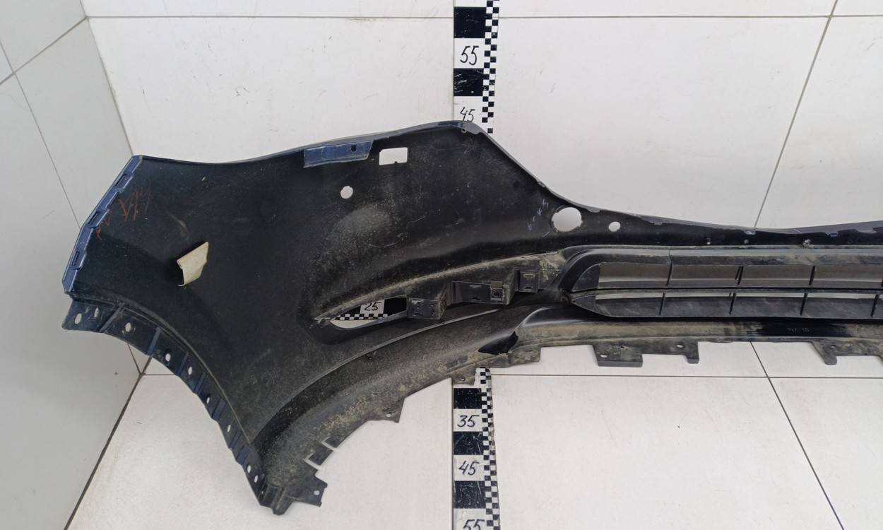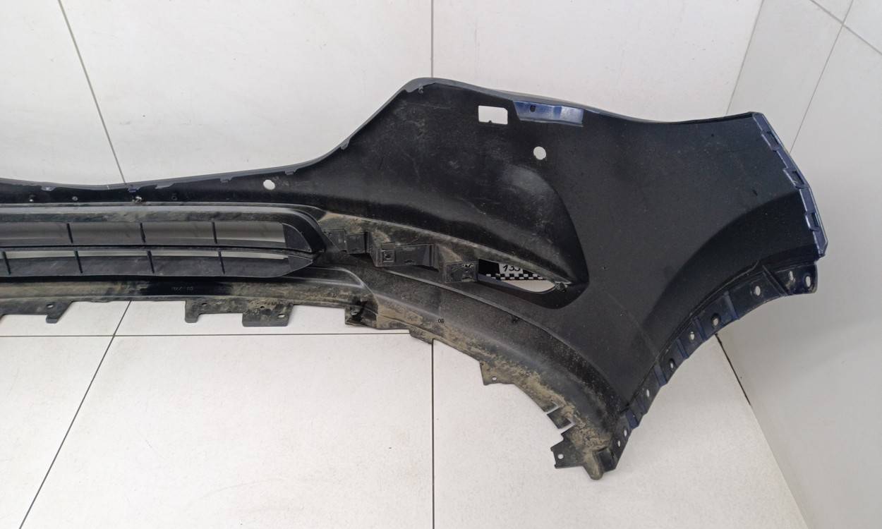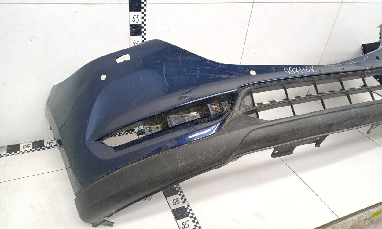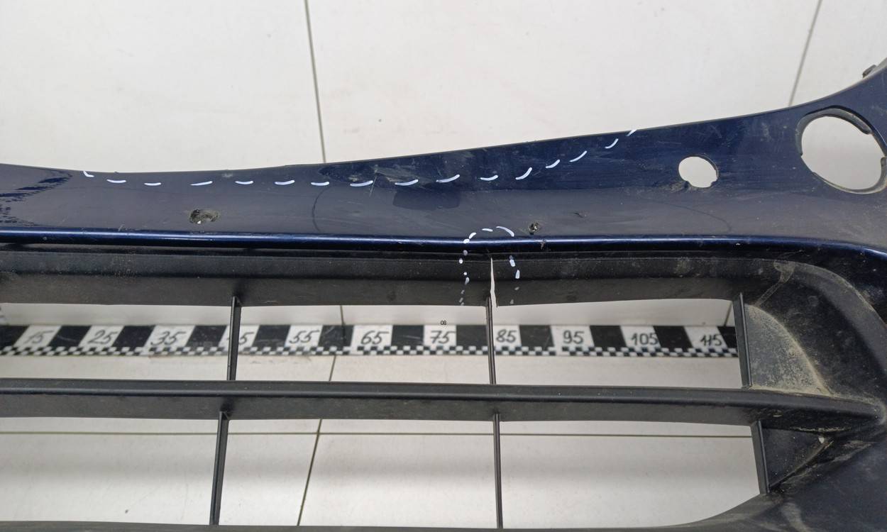 Состояние детали удовлетворительное. Синего цвета, потертости, царапины. Трещины и небольшая деформация пластика бампера в центральной части, сломано одно крепление решетки, крепления бампера целые. Потребуется ремонт и покраска