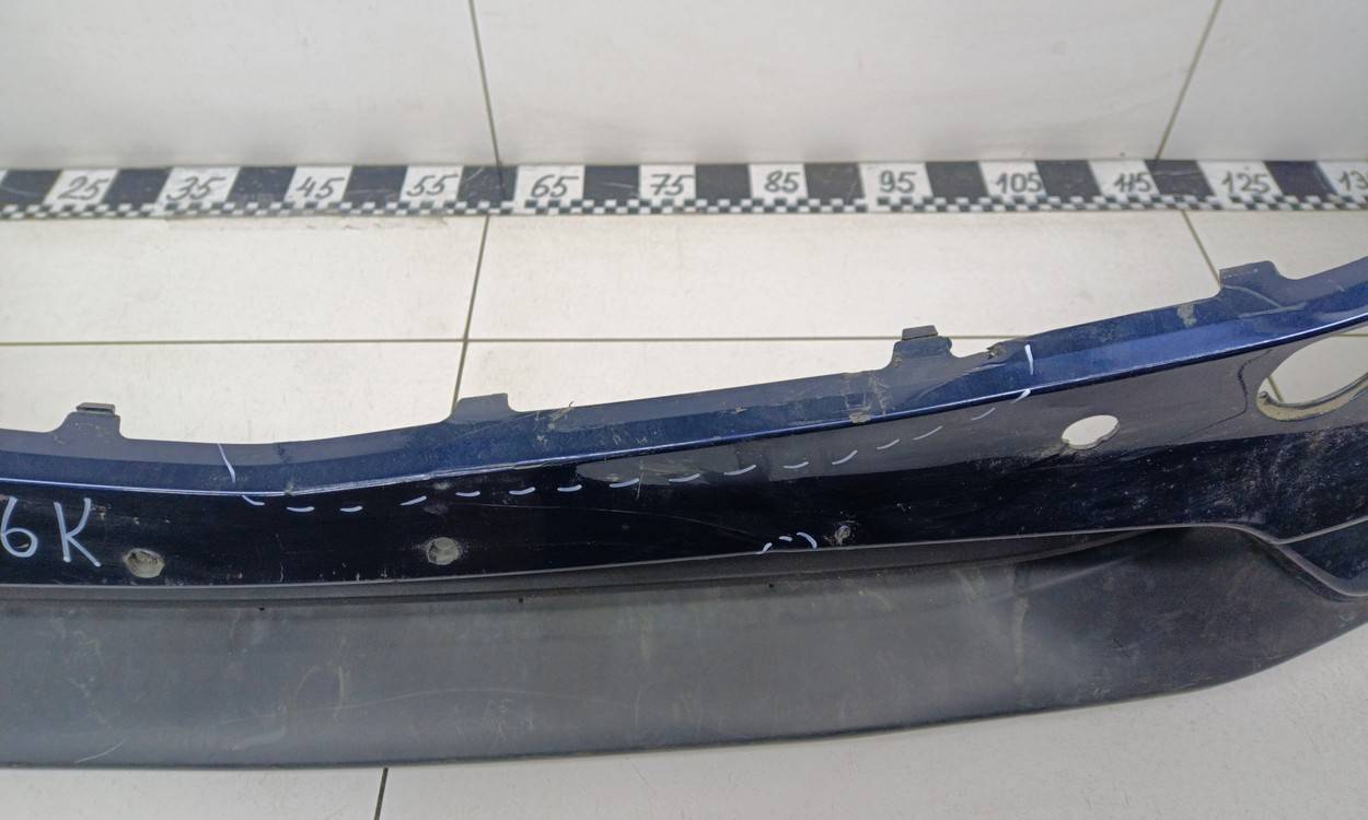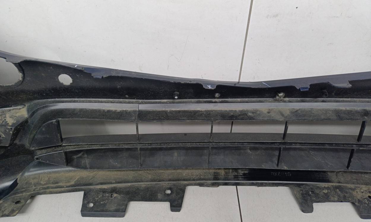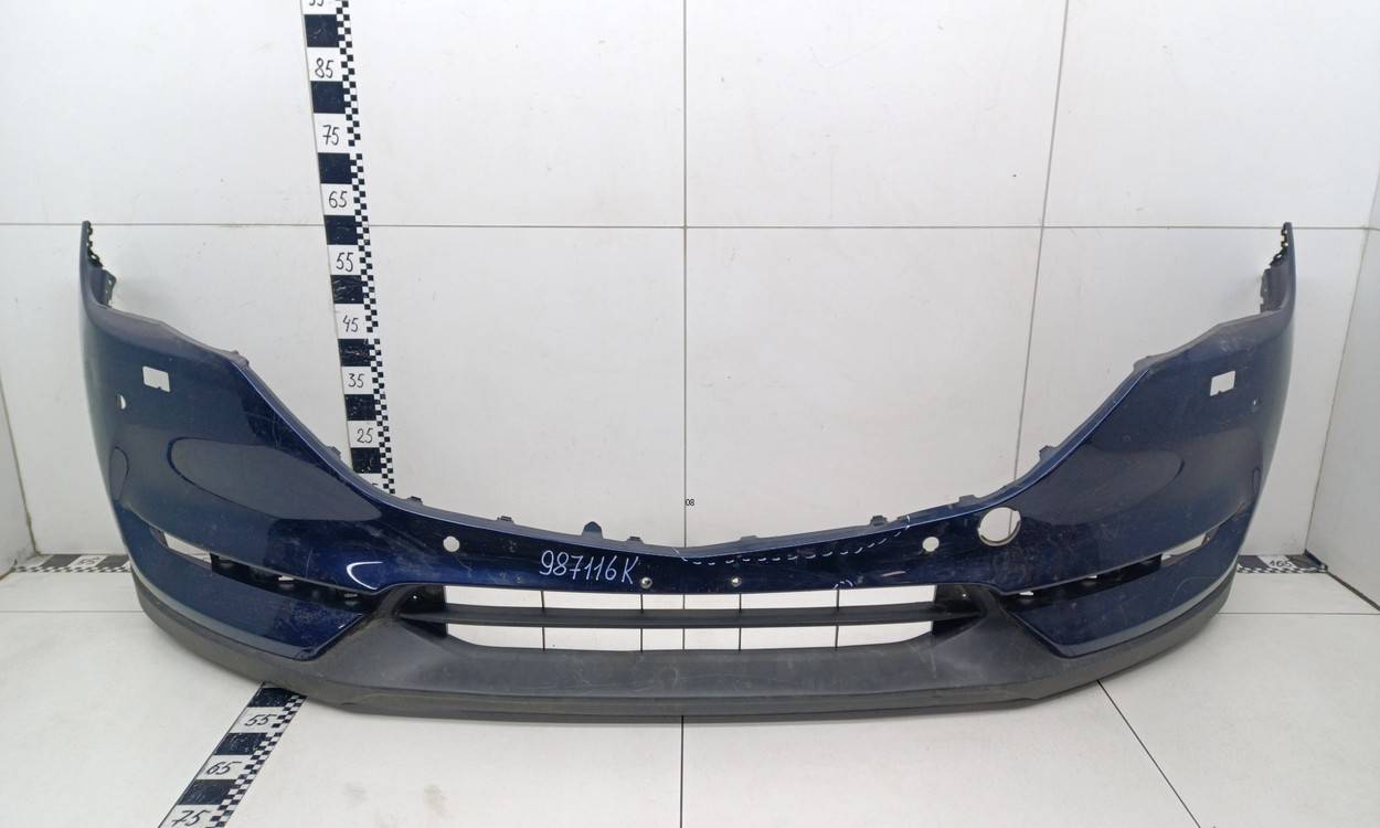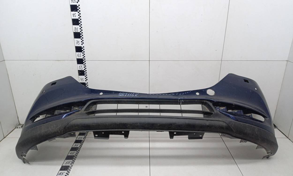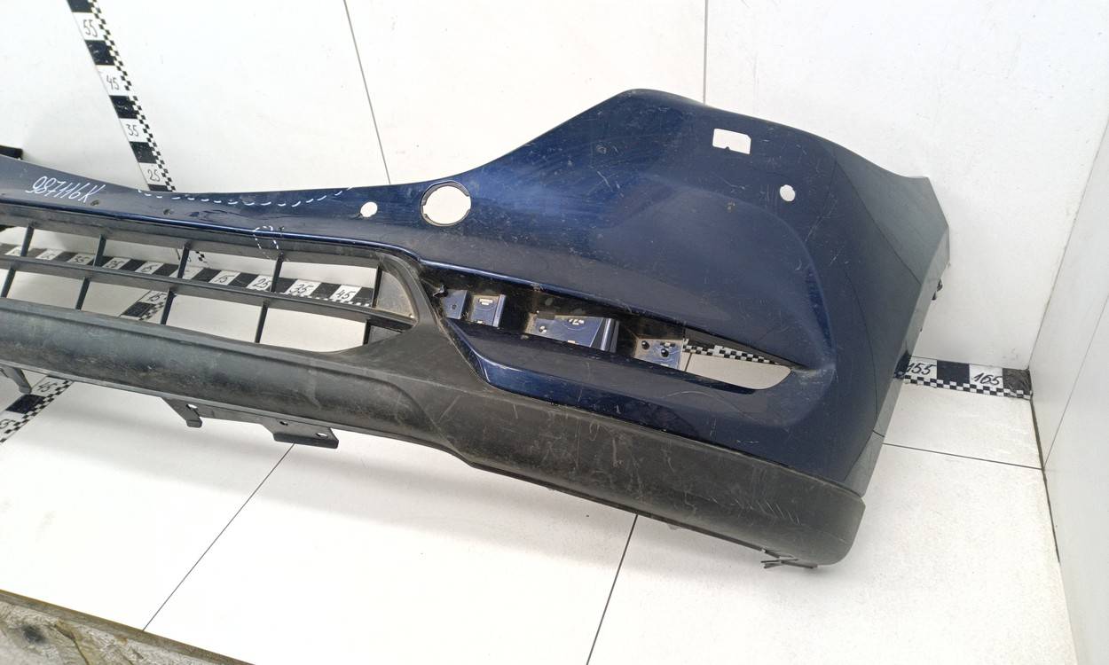 Состояние детали удовлетворительное. Синего цвета, потертости, царапины. Трещины и небольшая деформация пластика бампера в центральной части, сломано одно крепление решетки, крепления бампера целые. Потребуется ремонт и покраска