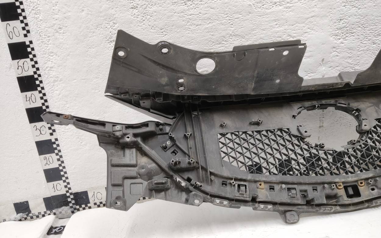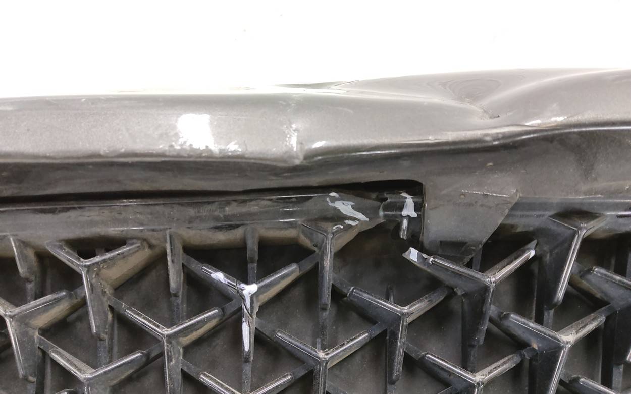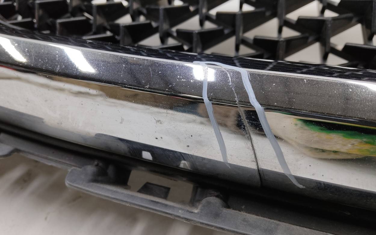 Состояние детали хорошее. Накладка коричневого цвета, с вмятиной. Небольшой скол в верхней части решётки, трещина на правой хромированной накладке. Крепления решетки целые, сломано одно крепление на накладке передней панели. Потребуется ремонт