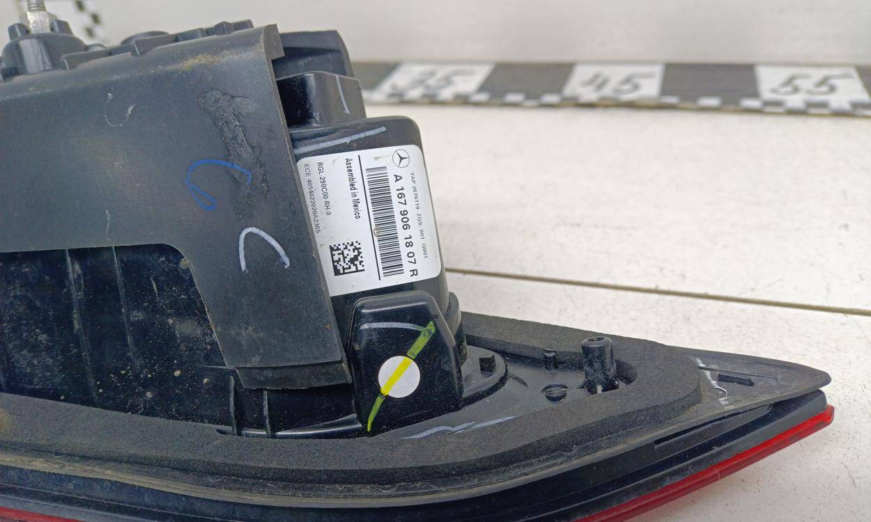 Состояние детали удовлетворительное. Трещина и скол стекла в нижней части по кромке. Корпус и крепления целые. Потребуется ремонт стекла Фонарь задний внутренний правый для Mercedes-Benz GLE-Klasse V167 2018>