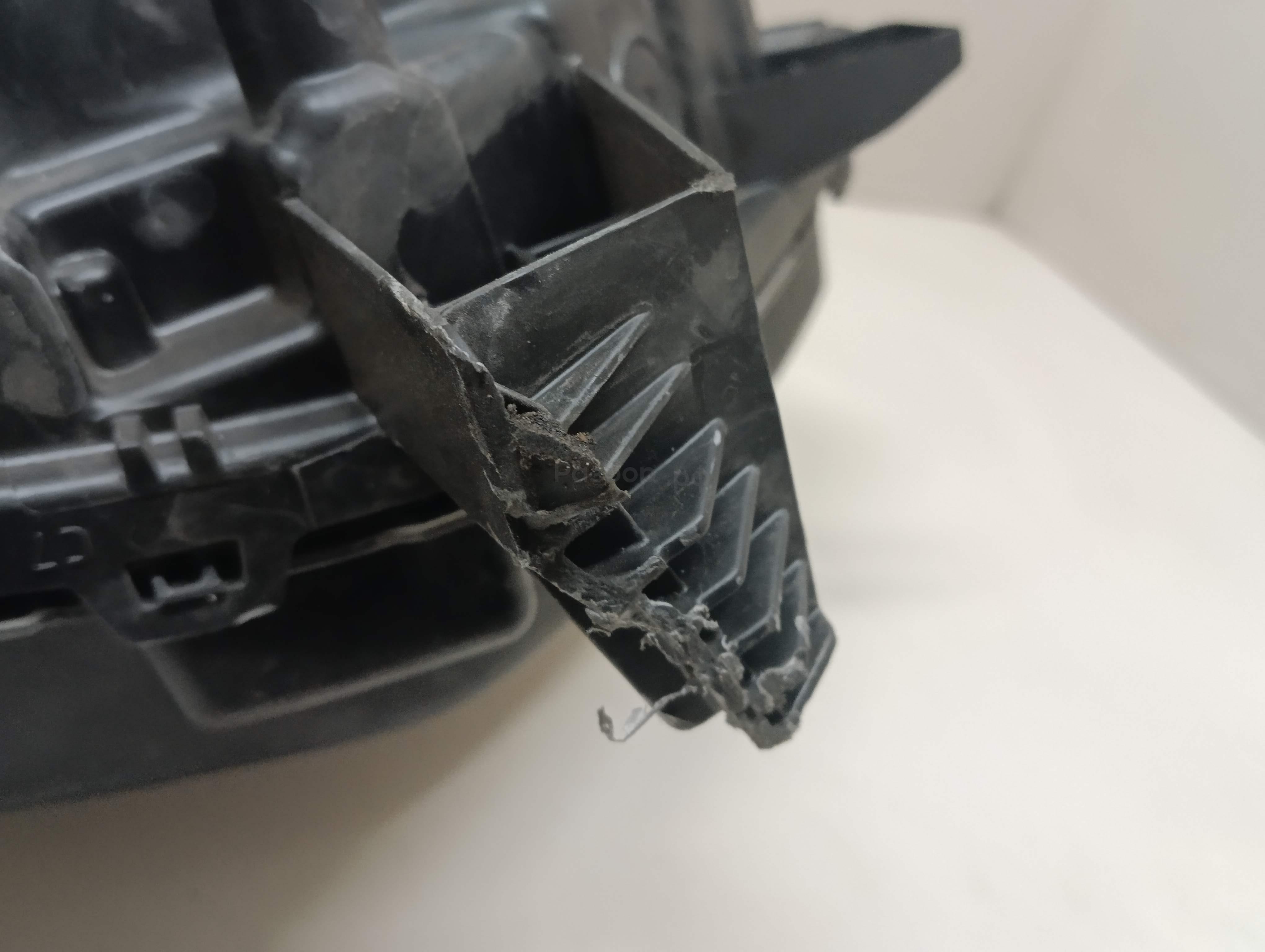 Состояние детали удовлетворительное. Следы эксплуатации, потертости и царапины, сколы кромки. Сломано крепление фишки подключения, одна направляющая, скол уголка пластика корпуса. Потребуется ремонт