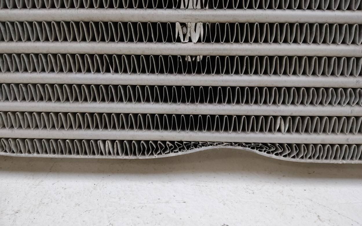 Состояние детали хорошее. Вмятины, дефект сот. Крепления целые. Потребуется незначительный ремонт Интеркулер для Renault Truck T-Series 2013>